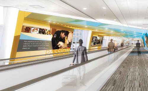 In addition to subtly incorporating SDF’s new brand, the design team also created areas where the message and associated imagery are more overt. For example, the corridor along the moving sidewalk will feature an architectural wrap showcasing four image compilations that depict experiences travelers may encounter while exploring the region, explains Bill Thiemann, managing director of creative services at Kolar. On a subliminal level, the graphics convey that the community is modern and forward-looking; but on a more literal level, it presents imagery from the community that shines a spotlight on regional stories, Peterson explains.