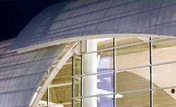 Terminal B’s façade features a curved roof made of perforated metal panels, which create a translucent, glowing appearance at night. A glass and steel curtainwall stretches more than 500 feet, allowing for expansive views and dramatic day-lit spaces up to 55 feet high. Each ground connection of the façade’s curved metal panels can glide up to 28 inches horizontally to accommodate expansion/contraction and meet seismic requirements for earthquakes.