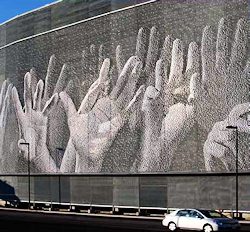 Artwork on the east facade of the Rental Car Center and Parking Garage helps airport visitors find and identify the new facility. |