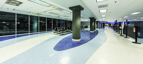 Terrazzo again emerged as the material of choice. “Terrazzo is a seamless solution without grout joints that makes it easier to maintain than many other tiles,” explains Doug Junkin, a project manager with Megamorphosis. “The seamless floor also makes it easier for rolling luggage, provides improved accessibility and reduces noise levels from rolling luggage and carts,”