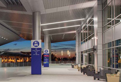 Airport officials hope that the facility’s green features will lead to silver certification from the Leadership in Energy and Environmental Design program. Lighting is monitored and controlled automatically; and water from the car wash bays is reclaimed and recycled. The building core’s elevators and escalators are open air, which decreases building heat during the summer. The public parking area includes two charging stations for electric vehicles.