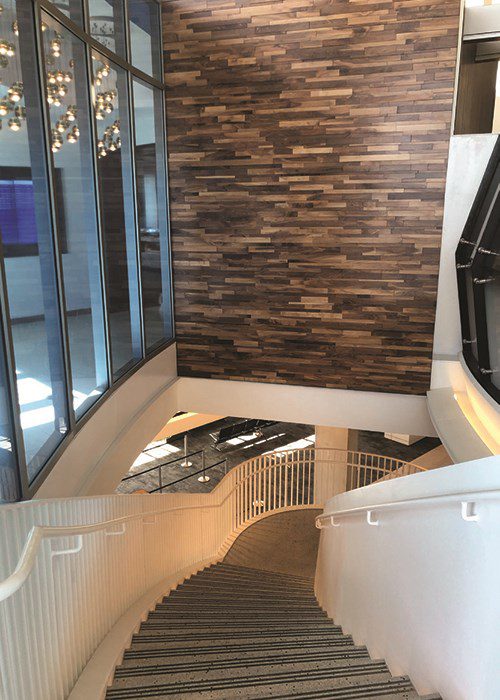 Two helix staircases on either side of the center tower are more obvious design features. Crafted in a three-dimensional spiral, the large staircases include 14 tons of steel and are anchored with two curved stringers for support.