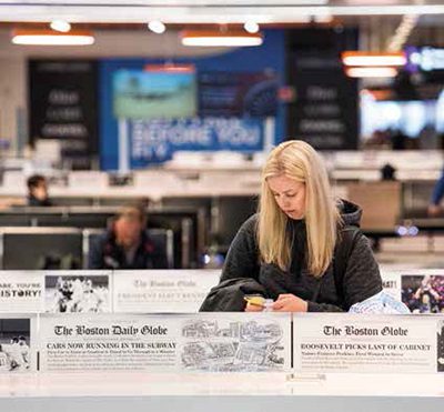 Work counters in the holdrooms are dubbed “news desks,” and the privacy dividers are covered with historic headlines from the Boston Globe and Boston Herald.