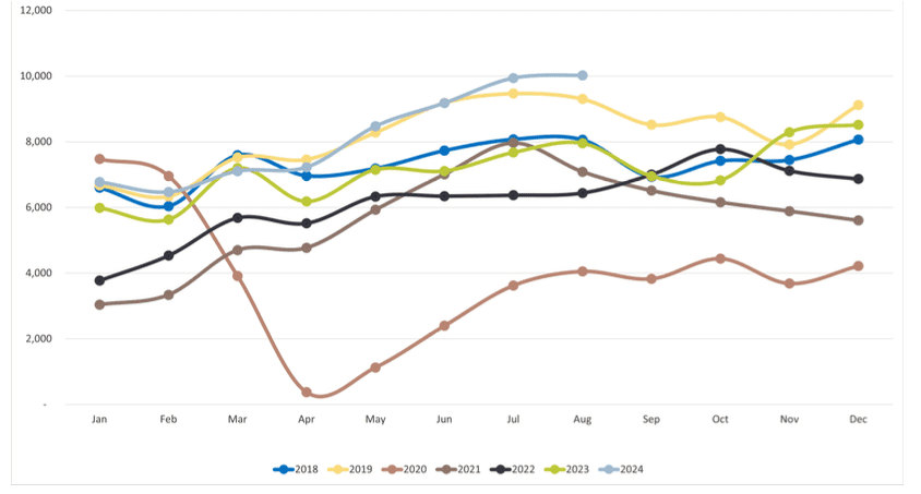 CASPER, WY – Casper / Natrona County International Airport announced that 10,020 enplaned passengers (passengers getting on aircraft) used the Airport in August, the first 10,000+ enplaned passenger month since October 2014 when 10,013 enplaned passengers used the facility. The August number is a 26% increase compared to August of 2023. To date, the Airport is showing an 18.7% increase compared to the same period in 2023.