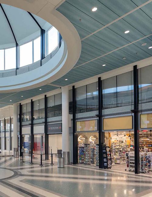 The pièce de résistance, however, is the 18-foot-tall glass dome that spans 1,742 square feet of floor space below and delivers light deep within the building (see Pages 8 and 9). Located in the center of the terminal, the light-filled atrium functions as the airport’s main meeting area and is the first space visitors see as they enter the building.