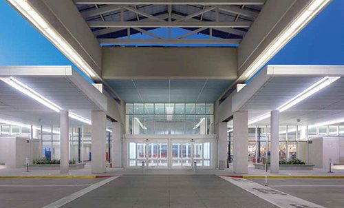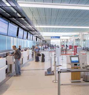 Now, the new central atrium serves as its heart. A two-story glass wall that separates the landside and airside areas gives travelers a view through Security and onto the taxiways and runways. On the curbside exterior, glass replaced an old concrete block wall, creating a visual connection with the interior of the building.