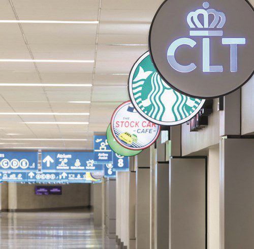 One of the first steps Gresham Smith took when developing CLT’s wayfinding master plan was to walk the entire airport to experience it from the traveler’s perspective. The team also studied surveys of more than 2,000 passengers who use the airport. Jim Harding, director of experiential design and wayfinding at the firm, calls this the “look, listen and learn approach.”
