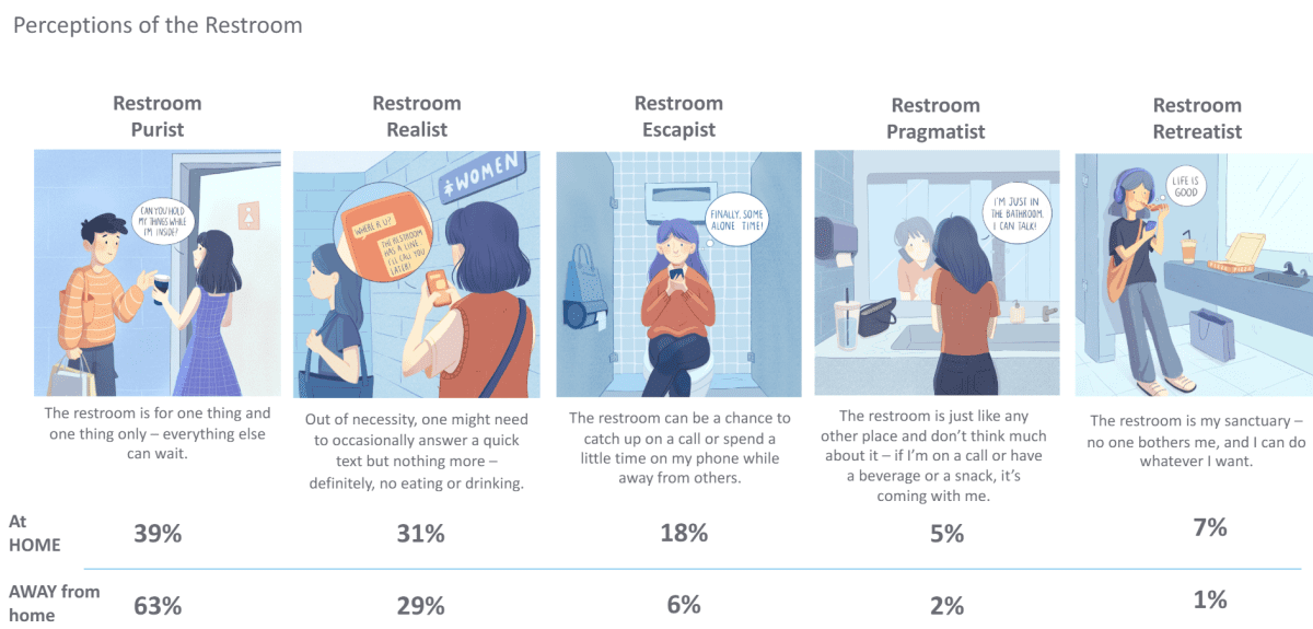 Based on its survey findings, GP PRO developed five personas that capture Americans’ beliefs and behaviors in regard to conducting business in the restroom, both at home and in public. At one end of the spectrum are “restroom purists,” who recognize the restroom is for one kind of business only; at the other are “restroom retreatists,” who believe the restroom is their personal office or sanctuary.