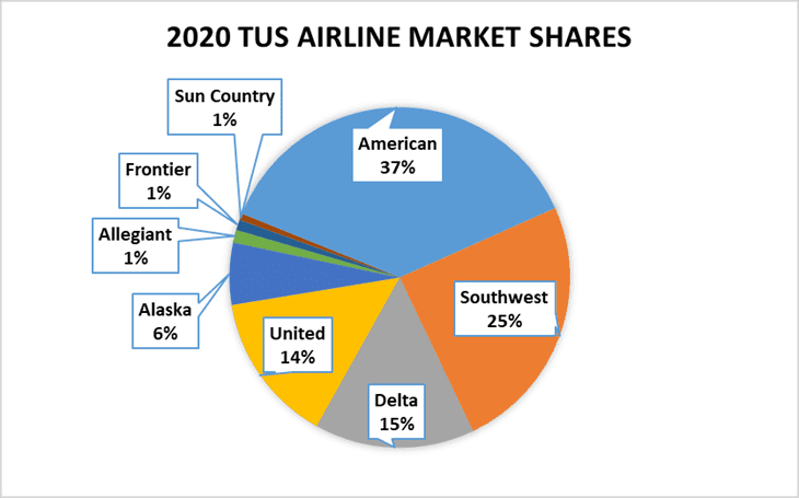 Less Than 2 Million Travelers for the First Time in 38 Years Airline passenger traffic at Tucson International Airport (TUS) dropped by more than half in 2020 to less than 1.7 million travelers as the impact of the COVID-19 pandemic took effect. The last time TUS had fewer than 2 million passengers was 38 years ago, in 1982. Total passengers at TUS for the calendar year fell to 1,698,777, down 55.3% from 3,797,201 in 2019. The statistics were reported Monday (January 25) during the Tucson Airport Authority’s annual meeting, which due to COVID-19 protocols, was a hybrid meeting with most members participating remotely while some participated from socially-distanced venues at the airport. “After four consecutive years of passenger growth, we were looking forward to 2000 being another robust year. We were on track in January and February to exceed 4 million passengers for the year, then the COVID-19 pandemic hit and the world radically shifted,” Danette Bewley, President and CEO told the TAA membership. “In March and April the airport terminal became still and quiet as airlines cancelled flights and grounded aircraft.” All airlines at TUS reported declines. American remained the airport’s busiest carrier, followed by Southwest, Delta and United. The rapid drop is shown in the daily numbers of departing passengers screened by the Transportation Security Administration at the airport. The highest total was 7,303 on February 23 and the lowest bottomed out at just 250 on April 16. Despite the decline, Bewley told authority members that COVID-19 “has not beaten us, and we will persevere.” She acknowledged, however, “Recovery will be a slow process and may take a few years.” Bewley credited the TUS Cares initiative for helping the airport maintain higher percentages of traveling passengers than most other airports and the national average. She said the TAA spent more than $250,000 on equipment and infrastructure improvements to improve cleaning and sanitization of the facility. The effort included up-leveling all cleaning and sanitization protocols, which resulted in TUS being the fifth airport in the world to earn STAR accreditation for cleanliness from the Global Biorisk Advisory Council. Bewley said the TAA worked with airlines throughout the year to restore and enhance air service. Of 19 nonstop destinations that were served from TUS before the pandemic, all but five had resumed before the end of 2020 and three more are due to be restored in February and March. The pandemic also prompted Southwest Airlines to look at new opportunities. As a result, in October Southwest added new nonstop flights between TUS and Houston Hobby Airport and in December announced that on March 11 it will start new nonstop flights to Oakland, California. |