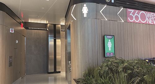 In the restrooms, Tooshlights above each stall indicate availability, and sensors in the paper towel and toilet paper dispensers alert maintenance personnel before supplies run out.
