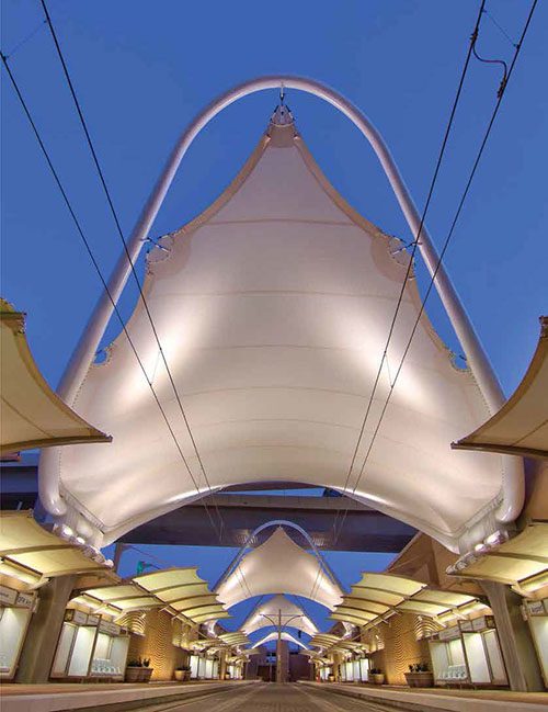Jacobs used several design elements to blend DART and DFW architecture, explains Tony Loyd, vice president and managing principal of the firm's global buildings division. Rather than specifying a metal roof for the station, designers opted for tensile fabric, which is a recurring element at various DFW entry points, such as vehicle plazas, curbside areas and now the light rail station. Five canopies shaped like bullhorns provide weather protection for passengers using the aboveground station.
