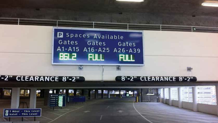The technology allows DFW to maximize the use of its parking assets, notes Buchanan. For example: In the older facilities, a parking structure is declared full when it reaches about 85% capacity, because it’s so difficult for visitors to find the other 15% of spaces that are available. Buchanan likens the search to finding a needle in a haystack: “People end up going from floor to floor, winding up and down just to find that one space that’s available.” To help, the airport often dispatches personnel to direct passengers to open spaces.