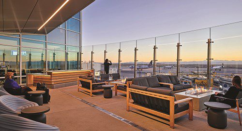 Decks on each of the west concourses showcase the Rocky Mountains; the deck on C-East offers views of the runways, with planes taking off and landing. Glass perimeters without mullions were specified to provide seamless views. All three decks include outdoor bars, firepits for ambiance and warmth in cooler weather, and pet relief areas.