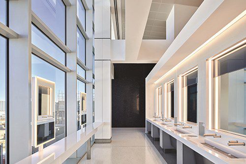 Although restrooms are a necessity, HNTB and Jacobs worked to make them modern and elegant. Designers added lots of natural light and an unusual feature—windows with views of the airfield and nearby mountains.