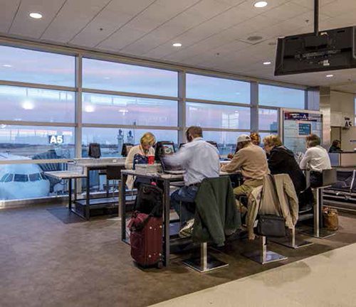 A combination of self-service ordering and gatehold delivery provides passengers with a new level of convenience. Two gateside seating areas, located on opposite ends of the nearly mile-long Concourse A, allow customers to order selections from the Eastern Market via wireless tablets and have food and beverages delivered-without ever leaving their gate area. Guests can order alcohol from the tablets but must provide proof that they are at least 21 years old to be served. A collection of 100 iPads attached to the community tables facilitates ordering and credit card payments.
