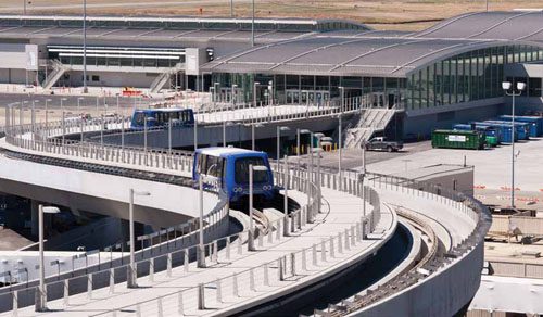 “Construction was a dual process,” Kelley explains. “We purchased the APM system in late 2008 so that Bombardier would have enough time to complete the system design, construct the cars and deliver them onsite.” At the same time, Turner Construction, in a line-item joint venture with Flatiron West, began construction of the elevated, cast-in-place concrete guideway structure. The 1,200-foot guideway slopes from 44 feet above grade at the terminal building to just 14 feet above grade where it joins the concourse building.