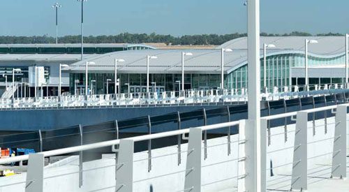 Timing the procurement of the APM system in relation to initial construction of the guideway proved to be somewhat tricky, recalls Kelley. To stay on schedule, crews began construction of the guideway slightly before the procurement of the APM system was finalized. “We attempted to make the guideway design as generic as possible,” recalls Kelley, “but we did have to go back and do some finessing to make it fit the Bombardier system.”