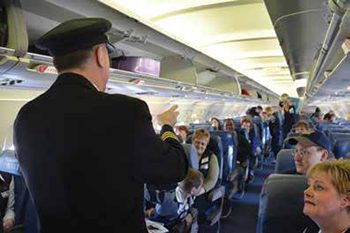 After the tours, participants are welcomed at the gate by a uniformed gate agent and practice handing over their tickets and boarding a plane. Inside, a flight attendant greets the participants, waits until everyone is seated, and presents the standard safety demonstration. Airline volunteers do everything but start up the engines – much to the disappointment of some participants.