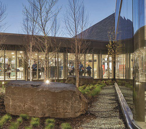 Inspired by the rolling hills and abundant hiking trails in southwest New York, designers opted for natural elements when re-thinking how the terminal could look and operate. The idea was to place the most stressful aspects of flying—security screening and waiting to board—in a serene courtyard, explains McCredie, a graduate of upstate Cornell University.