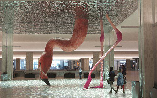 For some, the genius of Home by Matthew Mazzotta is more about what it doesn’t depict than what it does. Only the flamingo’s spindly legs, webbed feet, and brightly colored head and neck are visible, as if airport guests are underwater as the giant bird dips down to find food. Metal panels and shifting light patterns in the ceiling complete the immersive effect.