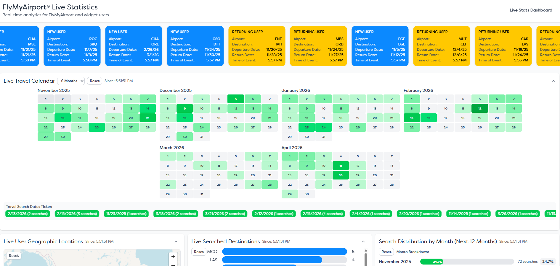 Launched just two years ago, FlyMyAirport integrates into airport websites, giving travelers a simple way to search airport-specific flights and book directly with airlines. The platform powers millions of searches each year, helping airports measure results, improve marketing efficiency, and strengthen airline relationships.