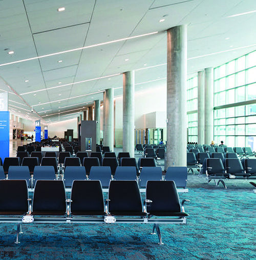 A 40-foot-tall glass curtainwall (see photo on cover) provides an expansive view from the terminal entrance to the airfield. Providing a clear view from ticketing through concessions out to the airfield leads to intuitive wayfinding, and also helps travelers feel more comfortable and relaxed, says Sucher.