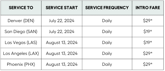 San José, Calif. â Ultra-low fare carrier Frontier Airlines (NASDAQ: ULCC) will begin daily nonstop service from San José Mineta International Airport (SJC) to five destinations this summer. In July, service will launch to Denver International Airport (DEN) and San Diego International Airport (SAN). In August, service will launch to Los Angeles International Airport (LAX), Harry Reid International Airport in Las Vegas (LAS), and Phoenix Sky Harbor International Airport (PHX). To celebrate, America’s Greenest Airline is offering fares as low as $19*.Â