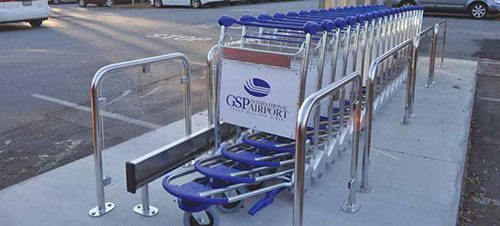 After consulting with Thompson Contract, GSP divvied up its 80 new carts between three spots: a double-row dispenser in Baggage Claim and two single-row units in the long-term, 1,600-space economy parking lot that is farthest from the terminal.