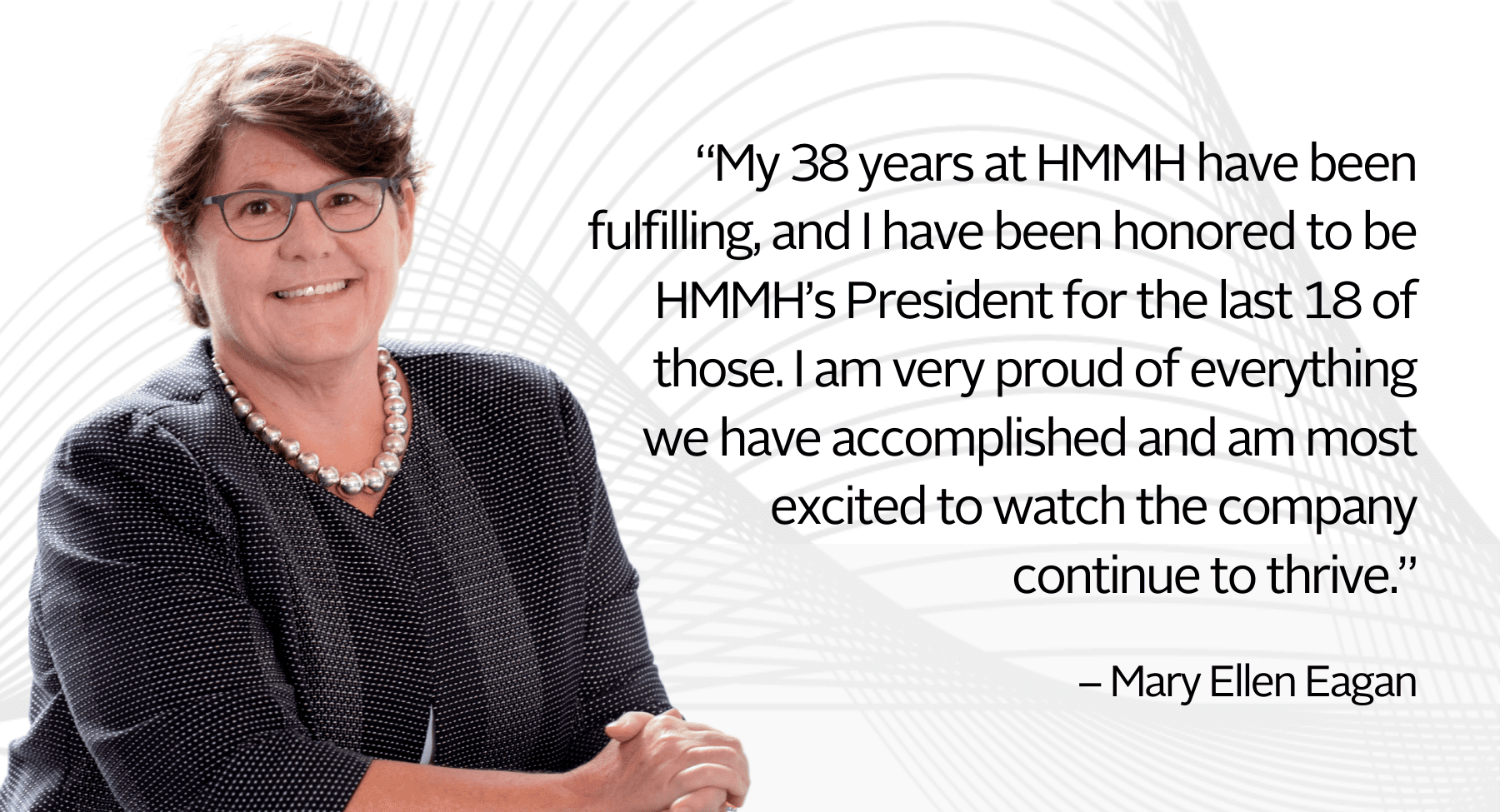 “During her tenure as President and CEO of HMMH, Mary Ellen brought business acumen, market strategy and focus to a company with a strong technical reputation and led the way to making HMMH one of the most successful, innovative, and progressive firms in the industry. She is well respected by her clients, employees, and industry colleagues. Her leadership and vision will be the legacy she leaves to HMMH.“