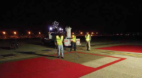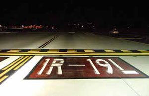 the overnight switch. PCI, a parking and highway improvement contractor, scheduled its crews to begin working at night on the smaller airfield markings about a week before the changeover, explains John "JD" Davey, the company's general superintendent. "We started as soon as the blue lights went off at 11 p.m. and had to have everything painted in, complete and off the runway by 6 a.m.," he relates.