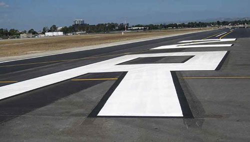 In addition to runway markings, 8 to 10 taxiway markings were water blasted off each evening and replaced with Ennis-Flint airfield paint containing reflective beads. "We painted the red boxes with the black border back in, and gradually restored the numbers to the taxiways, which was OK with the FAA and John Wayne Airport," says Davey.