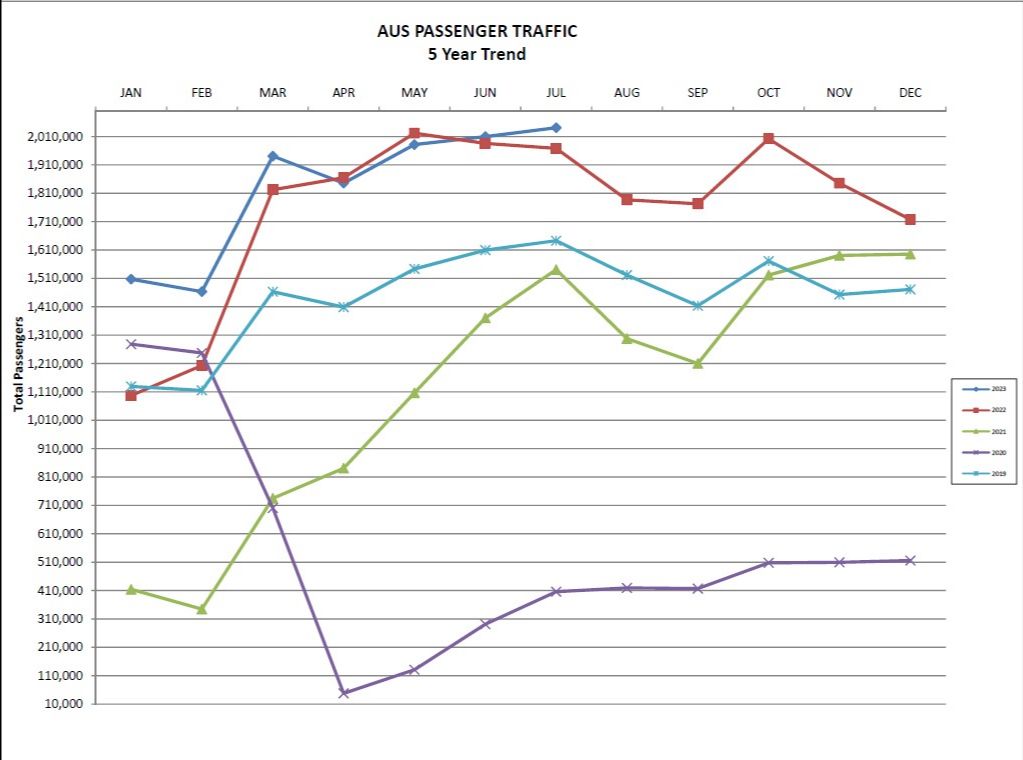 AUSTIN, TEXAS – Austin-Bergstrom International Airport (AUS) passenger traffic growth for July 2023 was up 3.68% compared to July 2022 with 2,040,981 passengers flying during the month, setting a new record for busiest month ever at the airport.