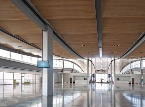 On the material recycling front, concrete that was demolished during the airside repaving was crushed onsite and mixed back in as part of the aggregate for the new pavement. In a uniquely Sacramento effort, wood from a demolished local bridge built in the 1920s or 1930s was incorporated into the new terminal. “We actually took about 67,000 board feet of the redwood, re-milled it and turned it into part of the ceiling,” explains Kelley. “So we were able to not only salvage a piece of history, but also keep a lot of good, old growth redwood from ending up in the dump as well.”