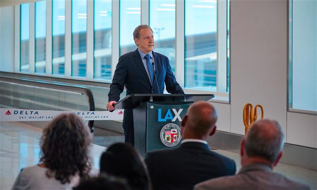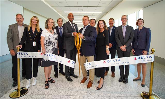 (Los Angeles) Today, Los Angeles World Airports (LAWA) and Delta executives, members of Los Angeles’s Board of Airport Commissioners (BOAC) and other key stakeholders celebrated the opening of the Delta Sky Way project at Los Angeles International Airport (LAX). The project represents a joint $2.3 billion investment of both LAWA and Delta funding to modernize one of the airline’s key global hubs. With Delta projected to serve the highest number of domestic passengers of any carrier at LAX this winter, paired with Delta’s strong international service schedule, the project will have a significant impact providing millions of guests with efficient and positive travel experiences. Opening ahead of schedule and on budget, the final section of the project – a new enclosed passageway that creates a direct post-security connection between the upper floors of Terminal 3 and Tom Bradley International Terminal (TBIT) – will eliminate the need for busing between Terminals 2, 3 and TBIT, greatly enhancing travelers’ satisfaction. The project’s ribbon cutting ceremony took place in the new passageway, allowing attendees to experience the connector’s time-saving convenience and with views of LAX’s north airfield framed by windows running the length of the passageway.