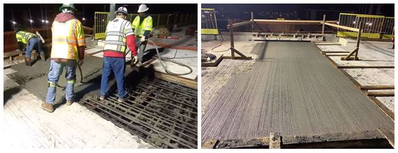 The concrete segments were cast in formwork and supported by larger traveling platforms. After the segments were formed and cured, the traveling platforms would move further ahead to help form the next segment. This process repeated on both ends of each span until the traveling platforms met in the middle. The superstructure over Sepulveda Boulevard was built in 12 segments, each approximately 15 feet in length, culminating with a 7.5-foot closure pour.