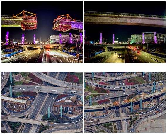 Construction of the segment over Sepulveda Boulevard (top left and right), along with a erial views of the segment from the end of December 2021 (bottom left) and the end of March 2022 (bottom right).