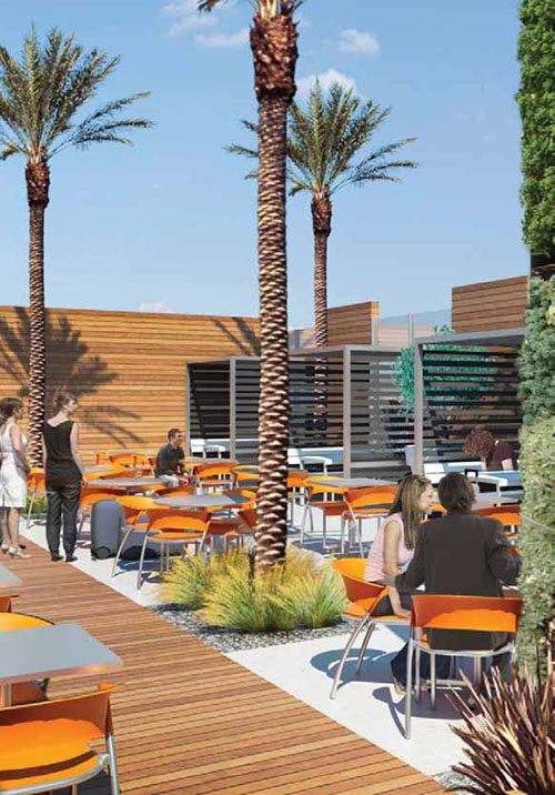 The new concourses were designed to reflect the airport’s goal of providing the highest level of customer service. “It is truly a resort-level experience,” says Rodriguez. Between a wine bar with outdoor seating, a table with a fire pit in the middle and a courtyard filled with palm trees, the new facility provides the indoor/outdoor experience southern Californians are accustomed to.