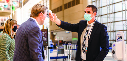 Guests with fevers are advised, but not required, to take additional precautions or chose not to travel. “We are not stopping anybody from traveling in this pilot program,” he reports. “But ultimately, if we were to implement this in full force, we would have to determine how we would prevent that person from entering the terminal or from flying.”
