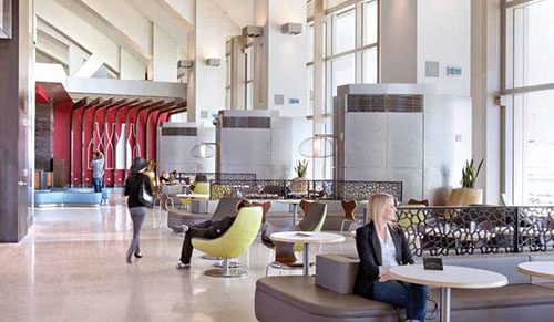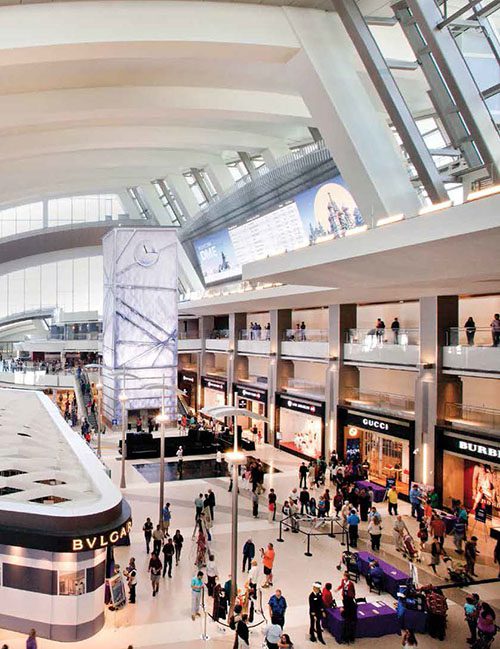 Inside the concourses, ceiling heights generally range from 40 to 60 feet. In the great hall, which was designed to resemble an old-world piazza, the ceiling soars to 100 feet and a terrace-like structure creates an open-air feel. The area plays up the design concept of the Southern California environment, notes Doucette. Bottom to the top, the great hall is almost 150 feet tall, and roughly the size of four football fields.