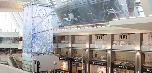 Move Over IMAX Huge electronic signage installations running original video content and arrival/departure information are a prominent feature in the new Tom Bradley International Terminal (TBIT) at Los Angeles International Airport (LAX). Collectively, the airport refers to the seven large media features as its Integrated Environmental Media System. On the equipment side, the $50 million system includes more than 12,000 square feet of light emitting diode (LED) tiles, hundreds of liquid crystal display (LCD) screens and a dedicated control and content management network system. In total, it includes nearly 9,600 square feet of active displays with an output of more than 105 million pixels – eight times an IMAX theater, note airport officials. The displays run roughly 60 ultra-high resolution multimedia productions, totaling more than four hours of original content. The system was designed to enhance the passenger experience as well as provide a revenue source through sponsorship opportunities, explains Michael Doucette, project manager at LAX. "These video displays were put in to enhance the [passenger] experience and to bring back the romance of travel," Doucette says. Content ranges from colorful, modern images about the Los Angeles area to a retro black-and-white tribute to Hollywood musicals to short pieces about various destinations of LAX airlines. "It's not advertising," notes Roger Johnson, LAWA's deputy executive director. "We're not trying to make LAX Times Square, Tokyo or the Vegas Strip." The Bon Voyage Wall, a framed 30-foot-by-50-foot display located after the security checkpoint and before the departure gates, runs slow motion videos of people jumping – "whimsical, enjoy-your trip" content is how Johnson describes it. Standing 72 feet tall, the Time Tower displays video content on all four sides of a two-bay elevator column. With 5,480 square feet of LED surfaces, a clock at the top and interactive features at the base, the tower is the visual centerpiece of the new digital system, and the great hall in general. The elevator doors are the only part of its surface not covered with screens. The Story Board, also inside the great hall, stretches for 120 feet, displaying images that highlight Los Angeles' connection to the movies, music, comic books and graphic arts. LED screens arranged in a mosaic pattern showcase destination-based content. "It doesn't focus on things like significant landmarks or the traditional images," Johnson explains. "It's more the day-to-day life and shows the culture of a departure city." Large blade panels on both sides of the great hall heading to the concourse are known as the departure portals; and new flight information displays span 75 feet long and 15 feet tall. Despite all of the system's cutting-edge features, LAX is working to make it even more impressive, with an application that will allow passengers to interact with the entertainment content or interface with the concessions program from their handheld devices, notes Doucette. Architect Curt Fentress allowed the airport to turn elements of its new digital media system into architectural features, as opposed to just hanging screens on walls, Doucette notes. "Curt embraced what we were trying to do and worked with Mike Rubin and Associates to come up with ideas that actually enhanced the architecture of the building," Johnson adds. LAX's integrated media system project was directed by Mike Rubin and Associates International and designed by Sardi Design. Daktronics supplied and installed $20 million of displays, and supported the system with an extensive fiber optic backbone, a dedicated power supply, dedicated HVAC and fire protection systems and an equipment/control room.
