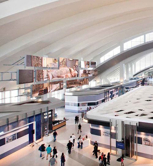 Move Over IMAX Huge electronic signage installations running original video content and arrival/departure information are a prominent feature in the new Tom Bradley International Terminal (TBIT) at Los Angeles International Airport (LAX). Collectively, the airport refers to the seven large media features as its Integrated Environmental Media System. On the equipment side, the $50 million system includes more than 12,000 square feet of light emitting diode (LED) tiles, hundreds of liquid crystal display (LCD) screens and a dedicated control and content management network system. In total, it includes nearly 9,600 square feet of active displays with an output of more than 105 million pixels – eight times an IMAX theater, note airport officials. The displays run roughly 60 ultra-high resolution multimedia productions, totaling more than four hours of original content. The system was designed to enhance the passenger experience as well as provide a revenue source through sponsorship opportunities, explains Michael Doucette, project manager at LAX. "These video displays were put in to enhance the [passenger] experience and to bring back the romance of travel," Doucette says. Content ranges from colorful, modern images about the Los Angeles area to a retro black-and-white tribute to Hollywood musicals to short pieces about various destinations of LAX airlines. "It's not advertising," notes Roger Johnson, LAWA's deputy executive director. "We're not trying to make LAX Times Square, Tokyo or the Vegas Strip." The Bon Voyage Wall, a framed 30-foot-by-50-foot display located after the security checkpoint and before the departure gates, runs slow motion videos of people jumping – "whimsical, enjoy-your trip" content is how Johnson describes it. Standing 72 feet tall, the Time Tower displays video content on all four sides of a two-bay elevator column. With 5,480 square feet of LED surfaces, a clock at the top and interactive features at the base, the tower is the visual centerpiece of the new digital system, and the great hall in general. The elevator doors are the only part of its surface not covered with screens. The Story Board, also inside the great hall, stretches for 120 feet, displaying images that highlight Los Angeles' connection to the movies, music, comic books and graphic arts. LED screens arranged in a mosaic pattern showcase destination-based content. "It doesn't focus on things like significant landmarks or the traditional images," Johnson explains. "It's more the day-to-day life and shows the culture of a departure city." Large blade panels on both sides of the great hall heading to the concourse are known as the departure portals; and new flight information displays span 75 feet long and 15 feet tall. Despite all of the system's cutting-edge features, LAX is working to make it even more impressive, with an application that will allow passengers to interact with the entertainment content or interface with the concessions program from their handheld devices, notes Doucette. Architect Curt Fentress allowed the airport to turn elements of its new digital media system into architectural features, as opposed to just hanging screens on walls, Doucette notes. "Curt embraced what we were trying to do and worked with Mike Rubin and Associates to come up with ideas that actually enhanced the architecture of the building," Johnson adds. LAX's integrated media system project was directed by Mike Rubin and Associates International and designed by Sardi Design. Daktronics supplied and installed $20 million of displays, and supported the system with an extensive fiber optic backbone, a dedicated power supply, dedicated HVAC and fire protection systems and an equipment/control room.