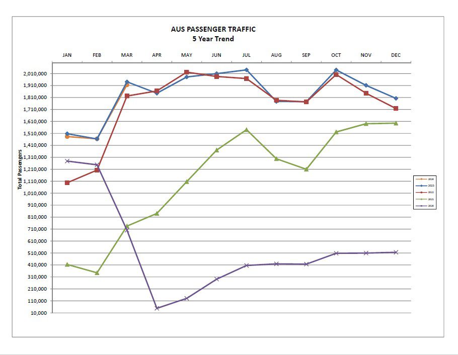 AUSTIN, TEXAS – Austin-Bergstrom International Airport (AUS) passenger traffic growth for March 2024 was down 1.29% compared to March 2023 with 1,915,987 passengers flying during the month.