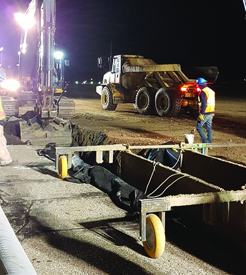 During the project, the airport averaged about two medevac flights per night. The airplanes were usually flying patients from the local regional hospital to a larger hospital in Calgary, explains Huntus. Each time a medevac airplane had to land, the work crews pulled their equipment off the runway and covered any trenches that were open along the edge of the runway. “It caused us a little bit of grief, but we factored that into the timing,” he says.