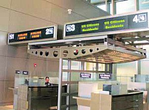 Once inside the door, large monochrome LED signs direct them to customs, baggage claim, restaurants and the airport's various terminals.