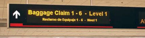 The process was reversed to aid international travelers landing at the airport. Once passengers exit the aircraft, they are directed into specific lines for customs. Once through that process, they are directed to baggage claim and finally to taxis, rental cars or curbside pickup locations. While the primary wayfinding system uses English and Spanish, baggage claim signs directing travelers to specific carousels are also printed in German.