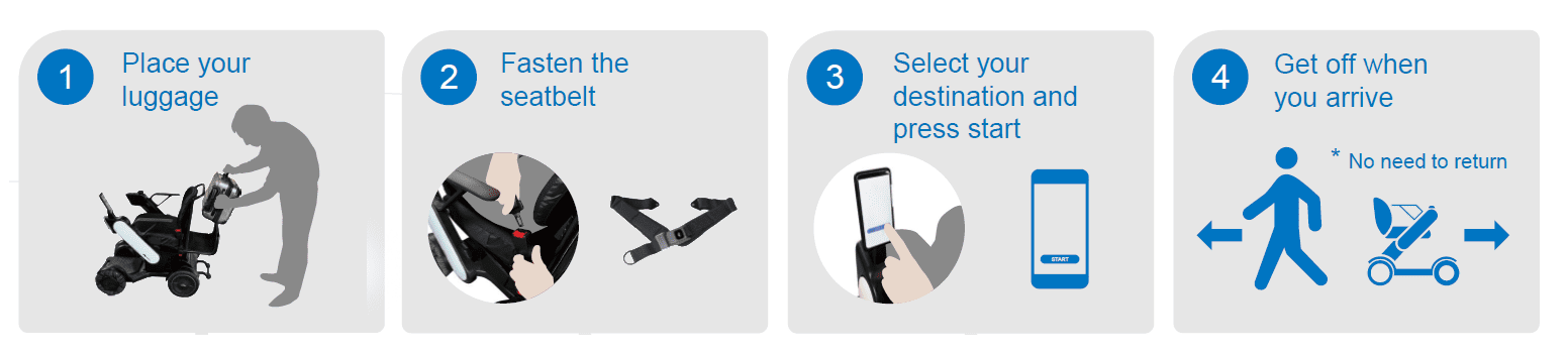 The autonomous power chairs are free and easy to use: Passengers simply select a destination on a screen and the device independently navigates through the terminal to their gate, then automatically drives itself back to its base at the Security Checkpoint. For safety, the device is equipped with an automatic collision avoidance system.
