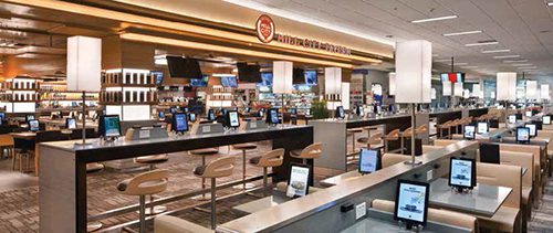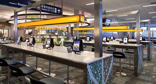 Passengers heading to gates 1 through 6 in Concourse G at Minneapolis-St. Paul International Airport may do a double-take when they find themselves in the CIBO Express Gourmet Market. They quickly realize, however, that they didn't misread the signs. Delta Airlines and OTG Management, together with the Metropolitan Airport Commission, have reimagined the very concept of holdrooms by breaking down boundaries in the gate area and blending spaces for sitting, dining, shopping, working and playing. After passengers pass through the market, they enter into a pod of six Delta Airlines gates, which is outfitted with a restaurant and mini-bar at the edge. The shared seating area includes a mix of high and low tables – all with USB and power outlets. Traditional beam seating lines the perimeter and includes numerous beverage holders and USB/power outlets. The most unexpected bonus, however, is a generous supply of iPads – free for passenger use. At about 80% of the seats in the gate area, travelers can sit down, check their email or flight status, review social media postings, play games, etc. – with no obligations attached. If passengers choose, they can use the iPads to order and pay for concession items for tableside delivery; but they are also welcome to simply sit down and use the tablets without incurring any costs. In total, more than 1,700 iPads were installed, reports Sean Aziz, director of communications for OTG Management. All of the high and low tables feature iPads as well as USB/electric outlets. While the iPads connect passengers with MSP concessions (food/beverage and retail), they did not replace human employees. In fact, OTG doubled the number of servers on hand when it introduced the iPads, reports Aziz. "While the iPad facilitates the orders by shooting them straight back to the kitchen, servers, in addition to delivering food, help customers navigate the iPad experience. Rather than being the order taker, they serve a hospitality function," he explains. "And if passengers just want to sit at the table and wait for their flight, perhaps browse through their email or play a game, that's their choice." Aziz considers the gate area the single largest piece of real estate inside an airport and one of the most desirable locations for customers to congregate. When designing the space in MSP's Terminal 1, OTG worked to maintain or increase the gate area's aisle space and seat count. The high and low tables selected allow passengers to slide carry-ons beneath the table, thus clearing more aisle space. "Not only is it a great design in terms of customer amenities, it's functional," Aziz relates enthusiastically. "We've created new revenue opportunities for vendors and a more enjoyable experience for travelers, who no longer have to go to their gate and sit like they are waiting for a root canal."  |