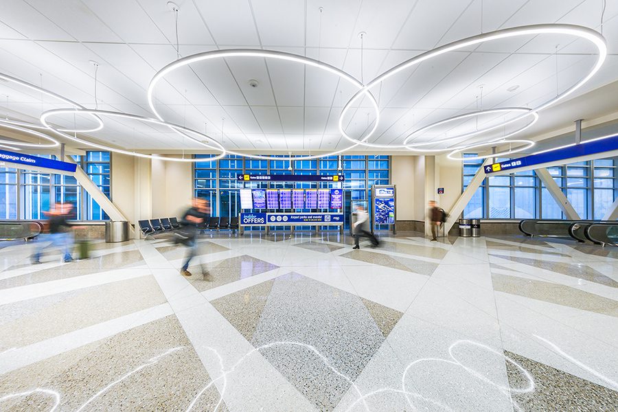 New terrazzo flooring and dynamic lighting are some of the interior improvements in Terminal 1 as part of the Airport Modernization Program at MSP Airport. Courtesy of the Metropolitan Airports Commission