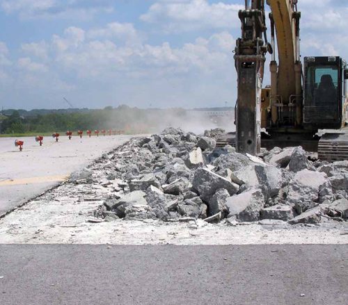 Nearly 90,000 tons of aggregate were produced from the 7,700-foot runway. In addition, 27,000 tons of asphalt were recycled. Steel dowel and reinforcing bars were separated during the recycling process and transported to a steel recycling company in Nashville.