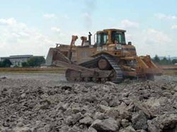 When the runway closed, construction crews demolished the pavement with a guillotine breaker/rubblizer. The concrete was then hauled to the onsite crushing and screening plant, where it was pugmilled to the appropriate size and moisture conditions before returning to the project.